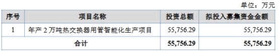 公司原拟募集资金55,756.29万元,扣除发行费用后,拟投资于以下项目:年产2万吨热交换器用管智能化生产项目。